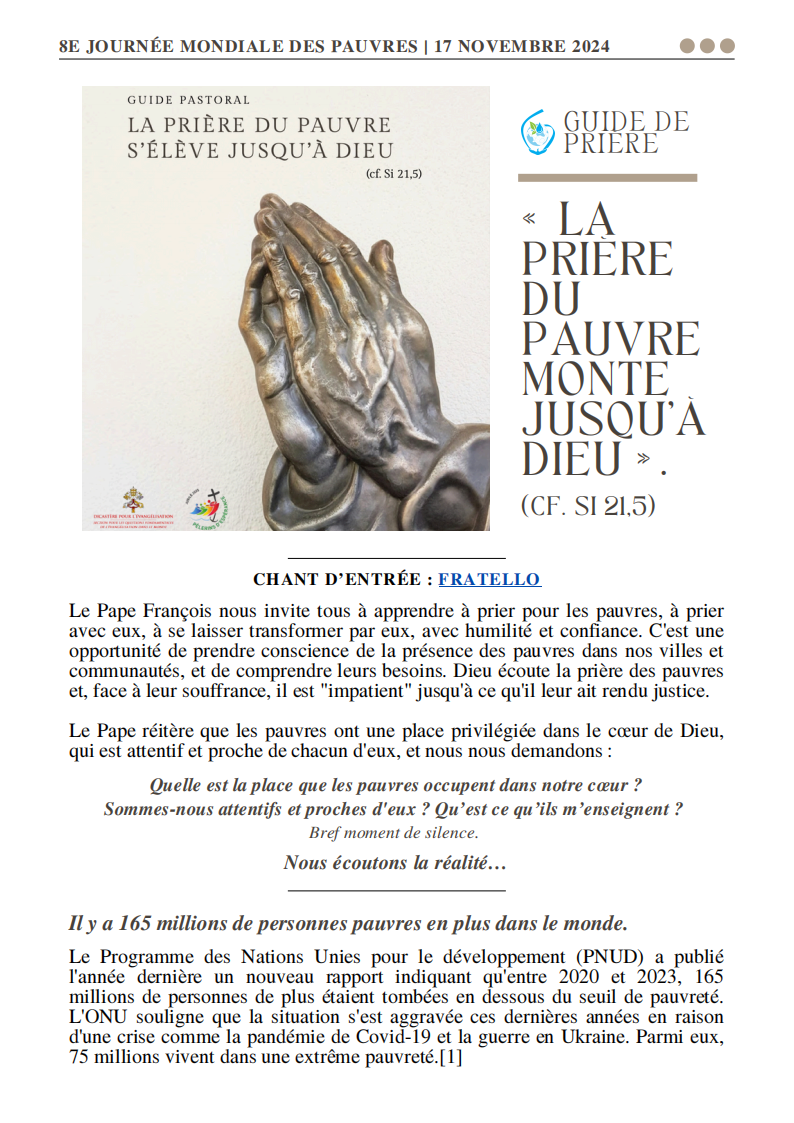 Le dimanche 17 novembre 2024 est laJournée mondiale des pauvres, une journée instituée par le pape François en 2017 pour que les catholiques « réfléchissent à la manière dont la pauvreté est au cœur même de l’Évangile ». Le thème de 2024 est « La prière des pauvres s’élève vers Dieu » (Sirach 21, 5).
