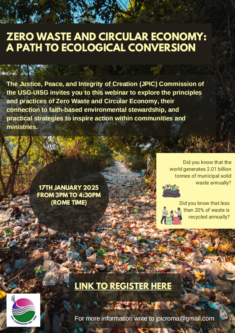 The JPIC Commission USG-UISG invites you to this webinar to explore the principles and practices of Zero Waste and Circular Economy, their connection to faith-based environmental stewardship, and practical strategies to inspire action within communities and ministries.